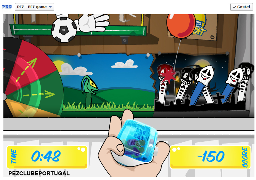 E não tardou! Do Facebook também já faz parte a aplicação para um jogo, no qual precisas acertar em Dispensadores como o Jumping Jack, balões, pássaros estranhos com as letras P,E e Z, ou entre outros marcar golos! Tudo isto com um PEZ SOFT que volta e meia precisas recargar com Doces! Atenção aos malvados PEZ Sleketon! Divertido no mínimo!